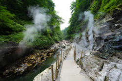細くて深い谷を降りていくと、蒸気が噴き出した熱々の川があります。